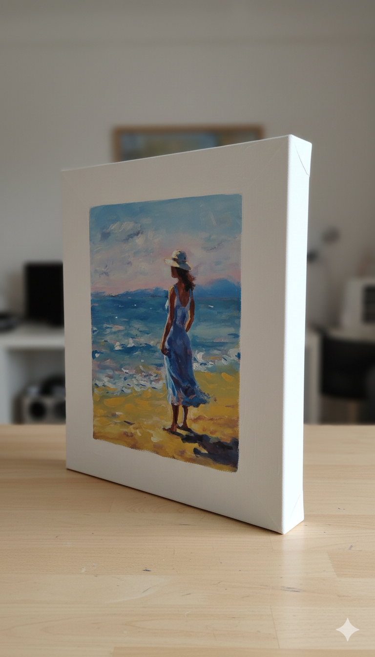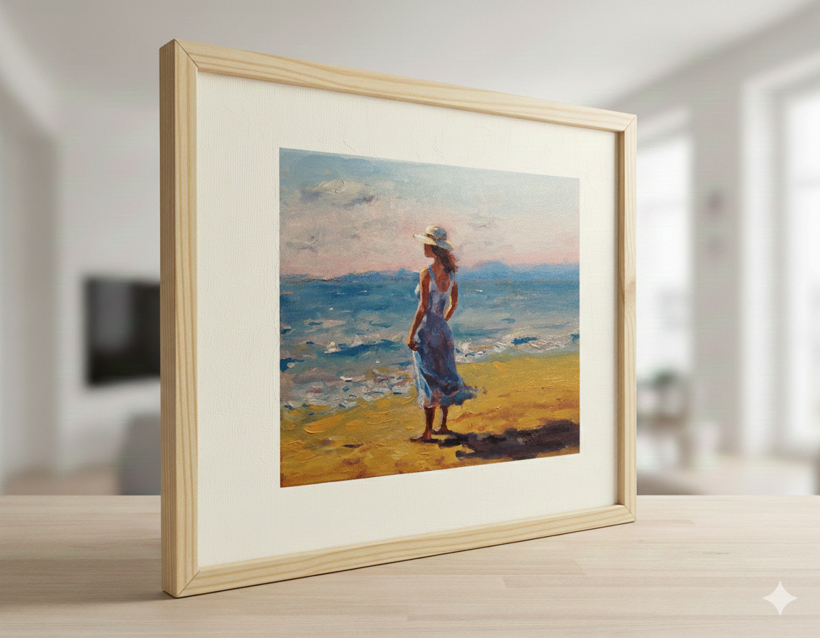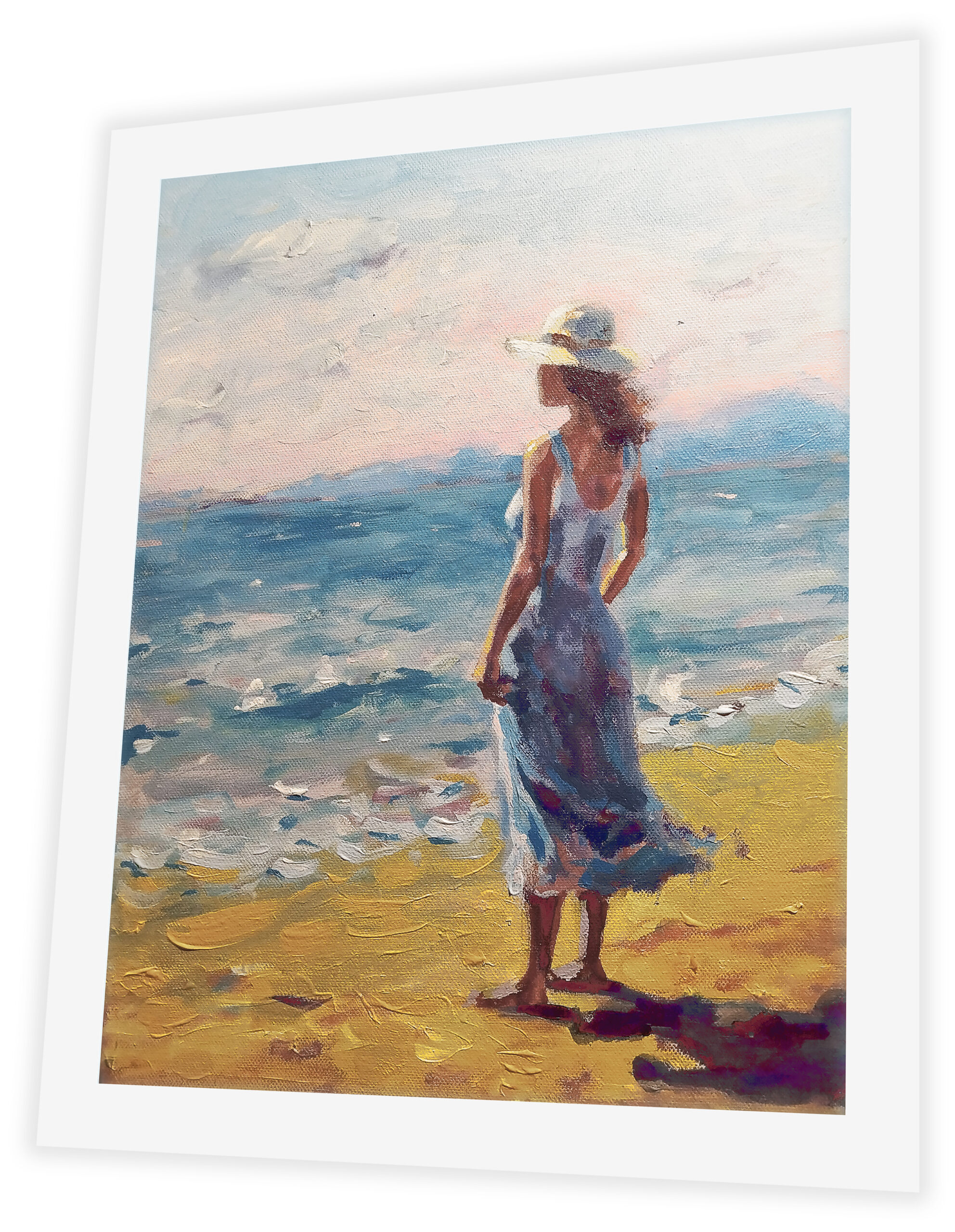 To typowa scena rodzajowa w pejzażu. Styl ten nawiązuje do dzieł mistrzów takich jak Joaquín Sorolla (mistrz światła i morza), gdzie postać ludzka nie dominuje nad naturą, lecz jest jej integralną częścią.