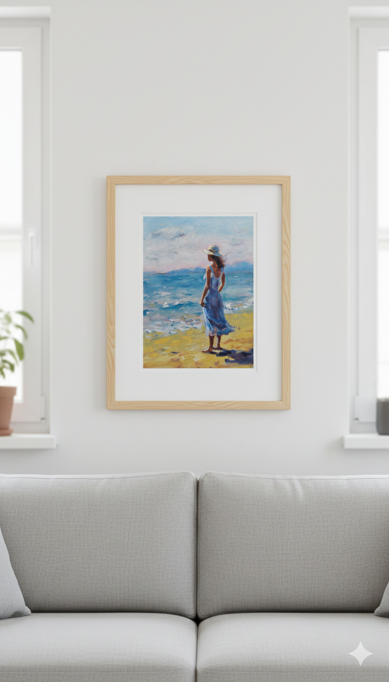 Paleta barw: Dominuje klasyczne połączenie ciepłych ugrów i żółcieni (plaża) z chłodnymi błękitami i lazurem (morze, niebo). Sukienka kobiety w odcieniu błękitu gołębiego stanowi łącznik między niebem a wodą, sprawiając, że postać niemal wtapia się w otoczenie.